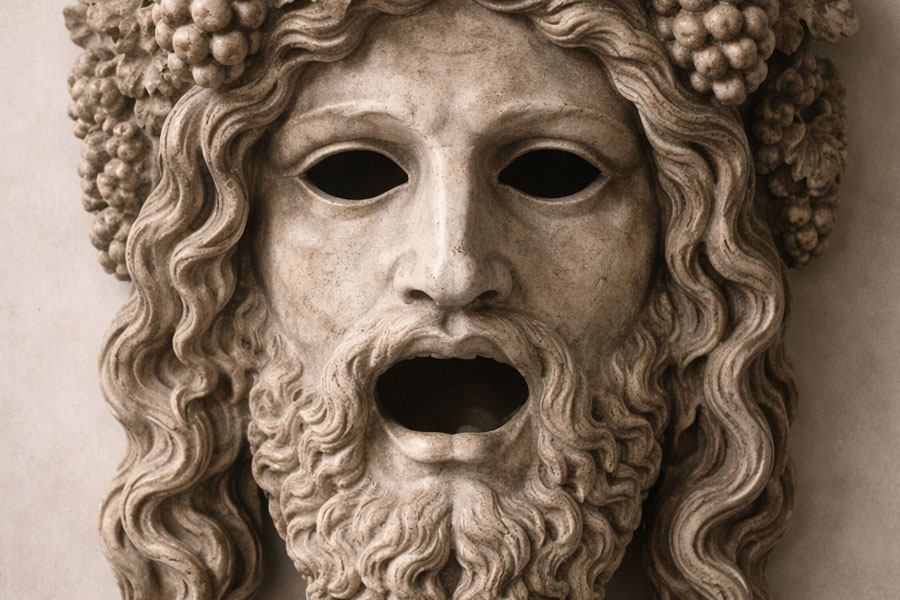 Il mito rimanda a Dioniso. Conosciuto come dio del vino e dell’ebbrezza, è soprattutto il dio della trasformazione, che sopraggiunge all’improvviso e sconvolge. Il suo simbolo è la maschera: nell’antichità la sua immagine agiva come uno specchio dell’anima. Indossare un volto diverso permetteva di “uscire da sé” per incontrare forze istintive e creative che la vita sociale tende a tacitare.