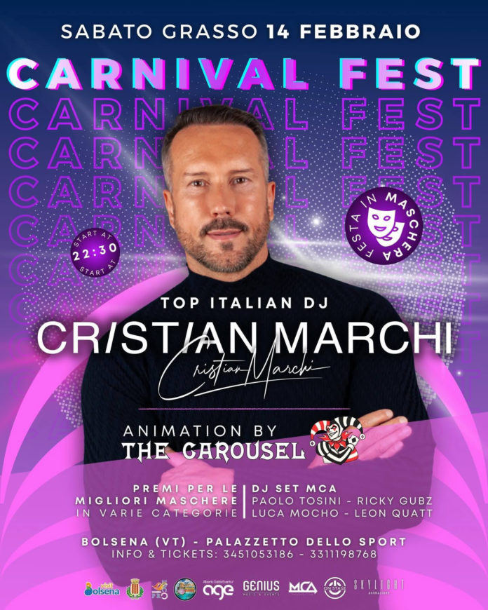 Per la prima volta a Bolsena salirà sul palco uno dei top Italian DJ, Cristian Marchi, con un DJ set ad alto impatto sonoro ed emozionale. La serata sarà arricchita da maschere, premi, show circense e performance spettacolari a cura di The Carousel, con animazioni, effetti scenici e momenti di forte coinvolgimento per il pubblico.