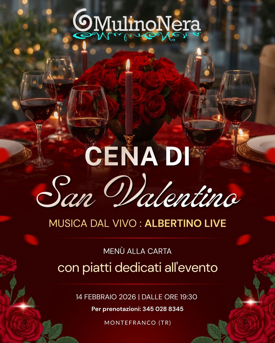 Sabato 14 febbraio il ristorante Mulino Nera propone una Cena di San Valentino pensata per celebrare la ricorrenza in un’atmosfera elegante e coinvolgente. L’evento avrà inizio alle ore 19:30 presso la sede di Località Mola Moretti, 2A, a Montefranco (TR).
