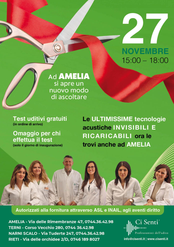 Giovedì 27 novembre 2025, dalle 15:00 alle 18:00, Ci Senti, centro specializzato nella salute dell’udito, inaugura la nuova sede di Amelia, in Via delle Rimembranze, 47.