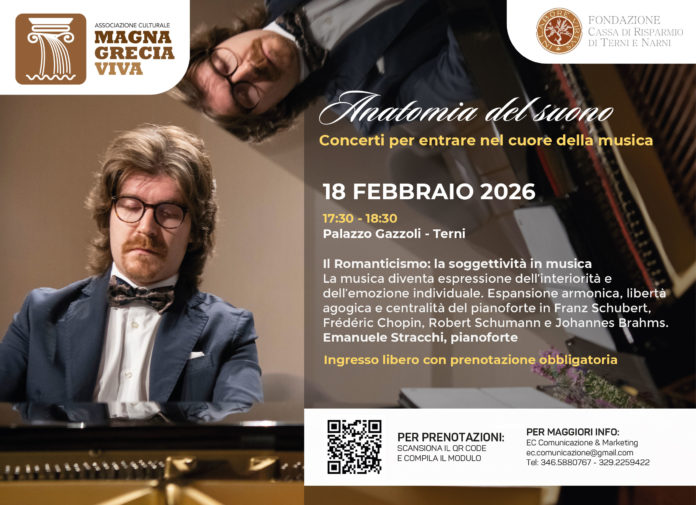 Martedì 18 febbraio, dalle ore 17:30 alle 18:30, Palazzo Gazzoli ospita l’incontro-concerto “Il Romanticismo: la soggettività in musica”, promosso dall’Associazione Culturale Magna Grecia Viva.