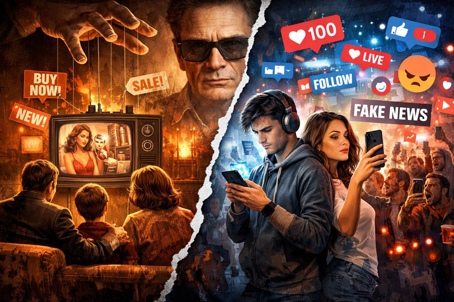 L’affermazione progressiva della rete e dei social, il mondo digitale in vertiginosa evoluzione hanno profondamente ridimensionato questo quadro. Il carattere passivo dello spettatore è stato completamente modificato. Lo schermo social ovvero lo smartphone è di piccole dimensioni, disponibile in qualsiasi momento e strutturalmente movimentato. Tutto viene consumato velocemente. Non c’è l’ipnosi televisiva, ma lo sprofondare in una realtà parallela.