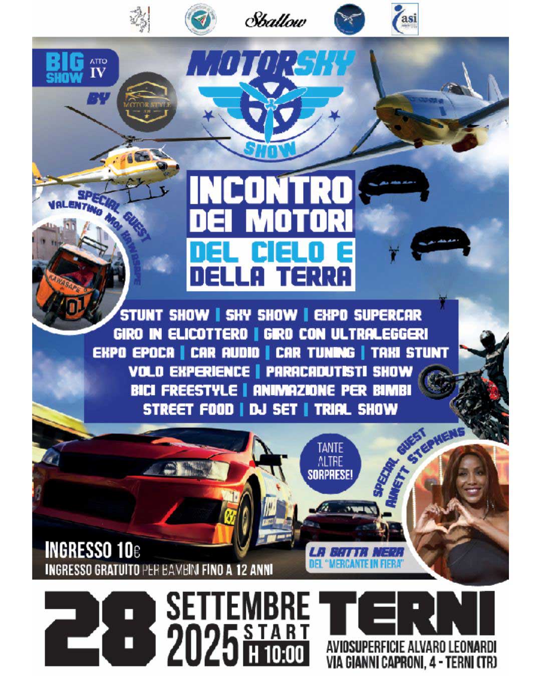 Sta per arrivare a Terni un evento storico e mai visto prima: il MotorSky Show, la spettacolare fusione tra i motori del cielo e quelli della terra, in programma domenica 28 settembre 2025 all’Aviosuperficie “Alvaro Leonardi”.