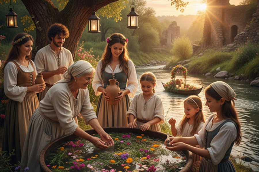 Il fuoco ha antiche radici pagane: è elemento di purificazione, di fertilità, così come l’acqua. Un ricordo ne richiama un altro: il rito dell’acqua che tutto purifica. Vasche, bagnarole colme di acqua e fiori ed erbe profumate considerate magiche come l’iperico, l’artemisia, la menta, la lavanda.